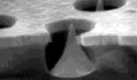 Some 50,000 tiny cones are deposited on one square millimeter of a silicon wafer. Each cone is about one micron tall (a human hair is about 50 microns thick) and pokes out through a small aperture, leaving a gap all around the cone of about half a micron.