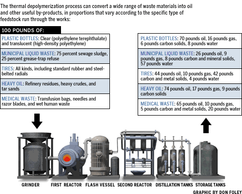 [...] Unlike other solid-to-liquid-fuel processes such as cornstarch into ethanol, this one will accept almost any carbon-based feedstock. If a 175-pound man fell into one end, he would come out the other end as 38 pounds of oil, 7 pounds of gas, and 7 pounds of minerals, as well as 123 pounds of sterilized water. While no one plans to put people into a thermal depolymerization machine, an intimate human creation could become a prime feedstock. "There is no reason why we can't turn sewage, including human excrement, into a glorious oil," says engineer Terry Adams, a project consultant. So the city of Philadelphia is in discussion with Changing World Technologies to begin doing exactly that.