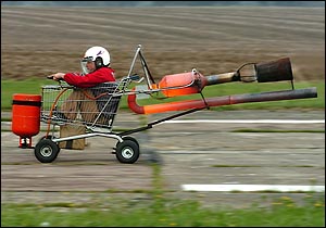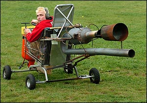 The microlight instructor, 35, built the gas and liquid fuel pulse jet from instructions off the internet. He pulled the trolley from a river and splashed £50 on scrap wheels, brakes and a steering device.