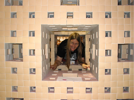After 9 years of effort, involving hundreds of folders all over America, the Business Card Menger Sponge was completed. The resulting object is comprised of 66,048 cards folded into 8000 interlinked sub-cubes, with the entire surface paneled to reveal the Level 2 and Level 3 fractal iterations.