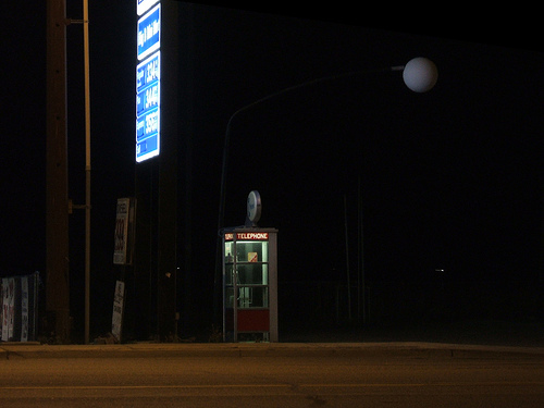 Walking home from the office on Thursday, I saw an aluminum post sticking out of the sidewalk, leaning slightly off perpendicular. I was a good ten or fifteen feet past it before I realised it was the support for a (now absent) payphone.