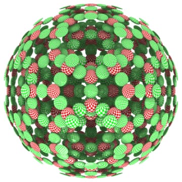 • Yellow gears: 13 teeth, 60 count.Red gears aligned with icosahedron vertices. Blue gears aligned with dodecahedron vertices. The central rotation axes are aligned with the vertices of a frequency 3v, class-I geodesic tessellation of an icosahedron.