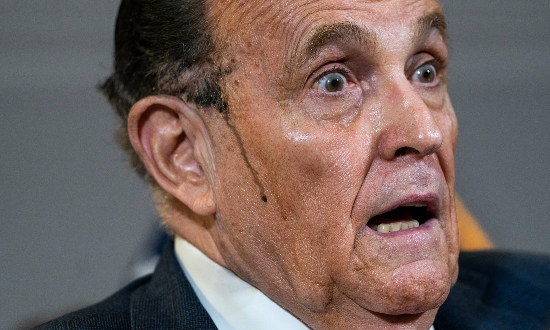 Needs more spray-on hair dye-tainted flop sweat: